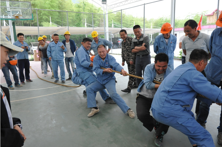 下午的拔河比賽以各部門(mén)為單位,共分采礦、頭破、一線、二線、固液、碼頭、科室、外協(xié)8個(gè)運(yùn)動(dòng)隊(duì)。通過(guò)抽簽分成每?jī)山M進(jìn)行淘汰賽,每組勝利隊(duì)進(jìn)決賽分出最終冠軍、亞軍、季軍。賽場(chǎng)上,兩組隊(duì)員們口中一起高呼著“一二,一二”, 雙手緊握長(zhǎng)繩,未參賽的員工自發(fā)組成啦啦隊(duì)為比賽隊(duì)員吶喊加油,吶喊聲此起彼伏,飄蕩在上空。拔河比賽由外協(xié)部門(mén)取得最終的勝利!