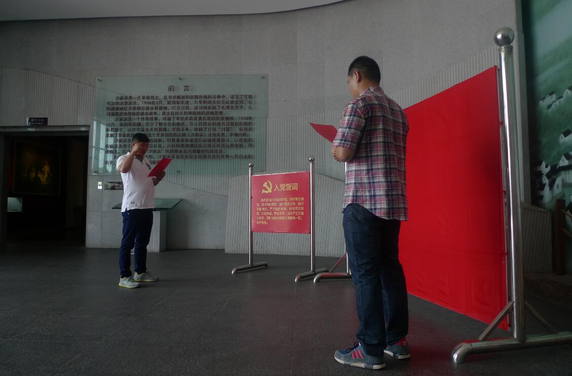 在沙家浜抗日紀(jì)念館,新入黨的張仕恩同志面對(duì)黨旗莊嚴(yán)宣誓,全體黨員也面對(duì)著黨旗重溫入黨誓詞,莊嚴(yán)向黨宣誓,表達(dá)了對(duì)黨的忠誠(chéng)和信仰。短短一天的行程,東進(jìn)橋、抗日司令部、民俗街、葉飛委員長(zhǎng)題詞的照壁、軍民魚水情主題雕塑等等都給我們留下了深刻的印象。