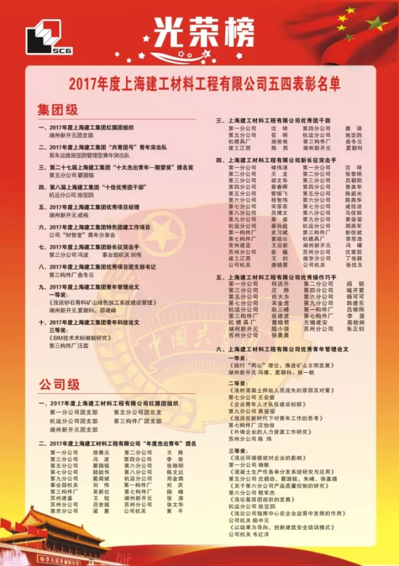 材料公司“五四”表彰大會暨青年突擊隊授旗儀式于511日下午在上海召開,會上表彰了一批在2017年成績突出的先進集體及個人。新開元共獲得了三項集團榮譽和六項材料公司榮譽(集團紅旗團組織、集團優(yōu)秀項目經(jīng)理、集團青年管理論文一等獎、材料公司紅旗團組織、材料公司年度杰出青年提名、材料公司優(yōu)秀團干部、材料公司新長征突擊手、材料公司優(yōu)秀操作巧手、材料公司優(yōu)秀青年管理論文)。